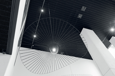 Aluminiowy sufit rastrowy MICRO CELL 20x150mm H26 w kolorze czarnym., który powstał na podstawie indywidualnej wizji biura projektowego JEMS Architekci. Sufit rastrowy typu Micro Cell w standardzie posiadający kwadratowe oczka o wymiarach takich, jak m.in. 30x30 mm, 50x50 mm czy 75x75 mm został zmodyfikowany na oczka prostokątne o wymiarach 20x150 mm H26. Dzięki temu zyskał bardzo nowoczesny, industrialny charakter, wpisujący się w obowiązujące trendy w wykańczaniu wnętrz komercyjnych.