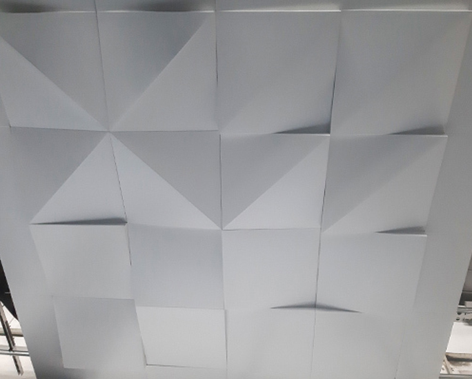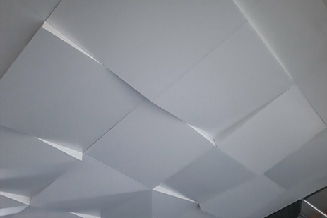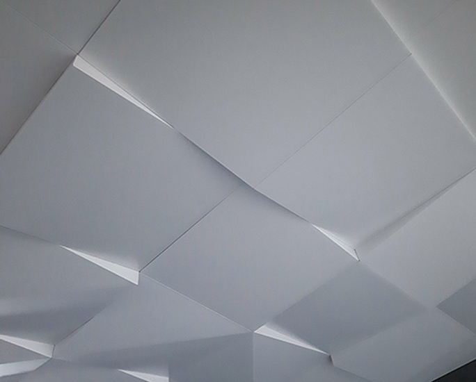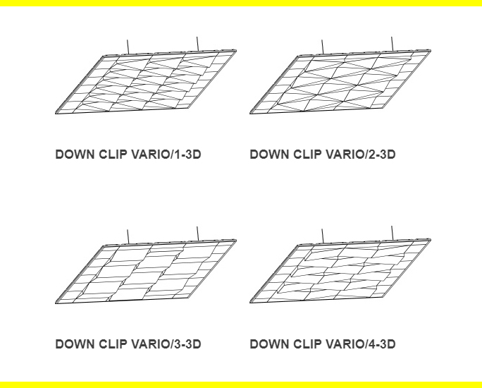 Cztery zupełnie różne konfiguracje paneli sufitowych DOWN CLIP VARIO to płyty sufitowe o wymiarach 500x500mm wysokości 30 i 80mm po przekątnych, tworzące przestrzenną, ściśle zamkniętą powierzchnię 3D.